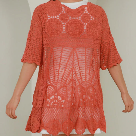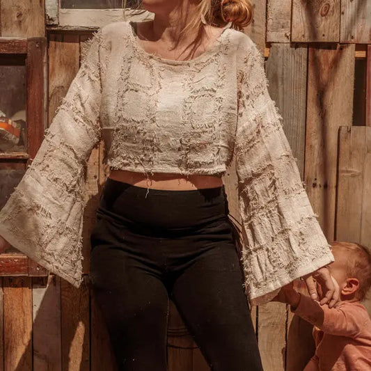 Grunge Boho Style Bell Sleeve Crop Top, Mesh Summer Top