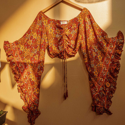 Hippie Flare Bell Sleeve Cinch Top - ORANGE PAISLEY